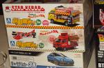 Die weiteste Reise aber hatte Pascal hinter sich gebracht: Er war in Japan unterwegs. Dabei konnte er auch die Tamya Showrooms in Shizuoka besuchen. Seine Einkäufe musste er auf die letzte Etappe seiner Reise verschieben. Hier besuchte er 4 große Modellbaugeschäfte im Tokyoer Stadtteil Akihabara. Eine Auswahl seiner Mitbringsel zeigte er uns. Er kaufte natürlich nur Kästen, die es hier nicht oder nicht mehr gibt oder die viel billiger als auf dem europäischen Markt waren. Da waren etwa die Maschinenkrieger, hier schon lange ausverkauft, in Japan immer noch zu moderaten Preisen erhältlich. Die Kei Cars sind weder im Original noch als Modelle in Europa ein Hit. In Japan sind sie überall anzutreffen, sie dürfen höchstens 3,40 lang und 1,48m breit sein und sind in vielen japanischen Städten vom Stellplatznachweis, der sonst in Japan beim Autokauf erforderlich ist, ausgenommen. Aber es gibt noch andere Vergüntigungen, die diese Kleinqwagen für Japaner attraktiv machen. Bei uns werden Modelle von Kei Cars nur selten angeboten. So leistete er sich einen AZ 1 in 1:24, ein Kei Car, der eher wie ein Sportwagen aussieht. Daneben hatte er mehrere Imbisstrucks dabei, zum Beispiel einen mobilen Ramen (Suppen) Shop und ein Kebab Verkaufsmobil, alle in 1:24. Natürlich hatte er auch einige japanische Zeitschriften mitgebracht.