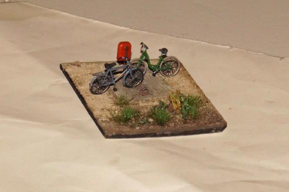 Hans hatte Plastik dabei: Im August hatte er uns die polnische Firma Military Scale com vorgestellt. Jetzt hat er 2 Fahrräder bemalt und lackiert in ein kleines Diorama integriert. In 1:87 waren die Räder recht günstig. Sie sind gut detailliert. Das Herrenrad sieht etwas älter aus und scheint ein militärisches Vorbild zu haben. Das Damenfahrrad stellt ein modernes Rad dar. Brems- und Lichtkabel sind im Druck nachgebildet. Er hat beide Miniaturen an einem Wochenende fertiggestellt. Bemalt hat er mit Stiften, allerdings ist dabei bei einem Rad die Kette gerissen. Er hält die Detaillierung der Speichen für sehr gut, sagte aber, dass die Speichen von fotogätzten Rädern etwa von Weinert noch feiner seien.
