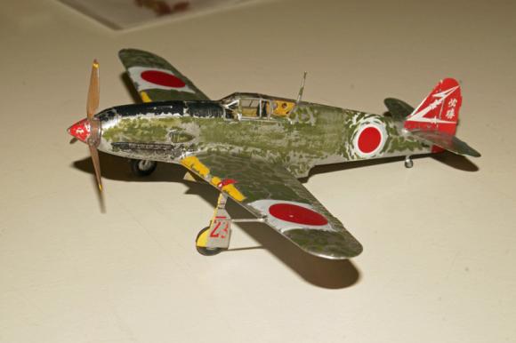 Robert hat seine erste Kawasaki Ki61 Hien von Tamya in 1:72 fertig. Das Vorbild flog 1941 erstmals und stieß im Sommer 1942 zu den Verbänden der japanischen Heeresflieger. Die Konstruktion war von Deutschen Vorbildern (He 100 und He112) beeinflusst und wurde von einer Lizenzversion des DB 601 angetrieben. So glaubten alliierte Piloten bei ihren ersten Luftkämpfen mit diesem Typ, Japan habe Bf109 importiert. Die Hien war 600km/h schnell und erreichte Höhen bis zu 11500 m. Etwa 3000 Ki61 wurden gebaut.