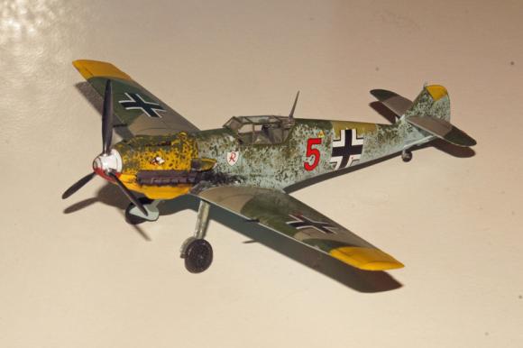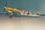 Robert hat seine Messerschmitt Bf109 E-4 vom JG 2 fertig gestellt. An dem Tamya Modell im Maßstab 1:72 hat er wieder verschiedene Maltechniken angewandt. Das Hellblau der Unterseiten und Rumpfseiten sowie RLM Grau der Grundtarnung und die gelben Flächen wurden mit der Airbrush aufgetragen. Für die dunkelgrünen Elemente nutzte er Farbstifte von AK. Beim JG2 wurde die Standardtarnung allerdings an den Rumpfseiten mit Pinseln und Schwämmen weiter nach unten gezogen. Auch Robert hat dieses Tarnmuster mit kleinen Schwämmen aufgebracht. Die Decals stammen aus verschiedenen Quellen. Die Kreuze sind aus dem Tamya Baukasten, der Bonzo Hund und das JG2 Wappen aus einem AZ Kit.