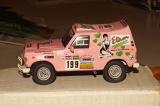 Reiner hatte seinen Toyota Land Cruiser FJ 60 Rallye Paris- Dakar 1986 in 1:43 dabei. Diese Version des Toyota Land Cruiser wurde von 1981 – 1990 gebaut. Die meisten Rallye-Fahrzeuge hatten jedoch eine Kunsstoff/Kevlar-Karosserie, die letztendlich mit der Serienversion wenig gemeinsam hatte. In einem meiner Bildbände über die Rallye Paris-Dakar fand ich ein brauchbares Foto des Vorbildes.. ,die auffällige Farbe und letztendlich der Hauptsponsor (Etam – Damenunterwäsche, wurde 1916 in Deutschland gegründet und ab Anfang der 1930er Jahre in Frankreich bis in die Gegenwart weitergeführt) haben mich zu diesem Modell geführt.