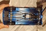 Der Ford ist in lila gespritzt und man kann ihn in zwei Versionen bauen. Lila ist nicht Peters Farbe, aber durch die Zweiteilung ist eine Zweifarbenlackierung ein Muß. Es ist in Mittelblau oben und Dunkelblau unten lackiert. Auch wenn es ein Snap Tite ist, sind bis auf den V8 Motor alle Teile dabei. Ein schöner Innenraum, ein Chassis mit Srahlachsen, sehr schöne Chromteile und Flammenaufkleber.
