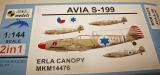 Ernst hatte 2 Kits in 1:144 dabei: Einmal die Avia S199 von Mark1. Das Modell hat ein Interessantes Vorbild. Während des Zweiten Weltkrieges hatte Nazi Deutschland die Produktion von Bf109 G Jagdflugzeugen auch nach Tschechien zu Avia bei Prag ausgelagert. Nach Kriegsende gab es noch viele angefangene Flugzeuge und Teile, dass man die Produktion für die Tschechoslowakische Luftwaffe fortsetzte. So fanden sich Teile für 200 Flugzeuge, den Rest hatte die Rote Armee abtransportiert oder sie waren durch Diebstahl und Plünderungen unbrauchbar. Allerdings hatte man ein Problem: Die Halle, in der die Daimler Benz Motoren lagerten, brannte aus. So hatte man viele BF109 aber keine Motoren. In Tschechien wurden aber Jumo 211 Motoren für Bomber produziert und von denen gab es genügend. So baute man diese Motoren in die Messerschmitt Rümpfe ein und die Flugzeuge erhielten eine große Holzluftschraube. So wurden über 500 S199 bis 1950 gefertigt. Die Flugeigenschaften waren zwar nicht berauschend, vor allem im Langsamflug wirkte sich das Drehmoment der großen Luftschraube negativ aus. Die Avia erreichte 589km/h in 6000m Höhe. Auch eine zweisitzige Trainingsversion der CS-199, von der insgesamt 82 Exemplare gebaut wurden, kam zum Einsatz.